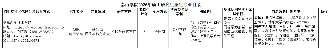 泰山学院信息科学技术学院2026年电子信息(网络与信息安全专业领域)硕士研究生招生章程