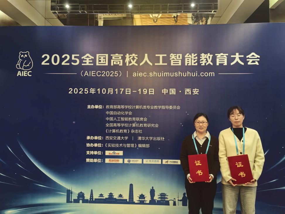 2025 年 10 月 17-19 日,由中国自动化学会、教育部高等学校计算机类专业教学指导委员会等联合主办,西安交通大学与清华大学出版社承办的2025 全国高校人工智能教育大会(AIEC2025)在西安召开。我院校级优秀基层教学组织嵌入式与物联网教学团队论文荣获优秀论文二等奖,论文海报荣获最佳论文海报,团队成员刘婧副教授和庞雅杰老师参会并领奖。