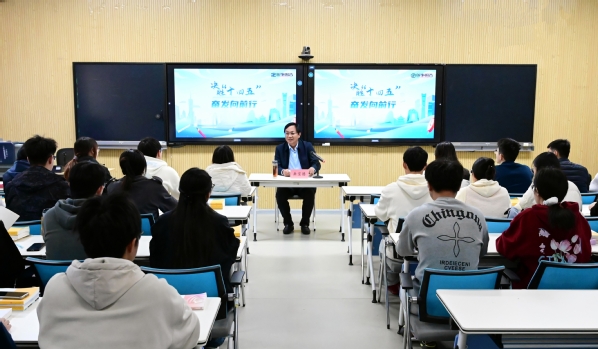 11月13日下午,学校党委书记岳宝德在2号综合楼A1011智慧教室,就学习贯彻党的二十届四中全会精神、解读“十五五”规划等内容,为信息科学技术学院、艺术学院2024级部分学生讲授思政课。