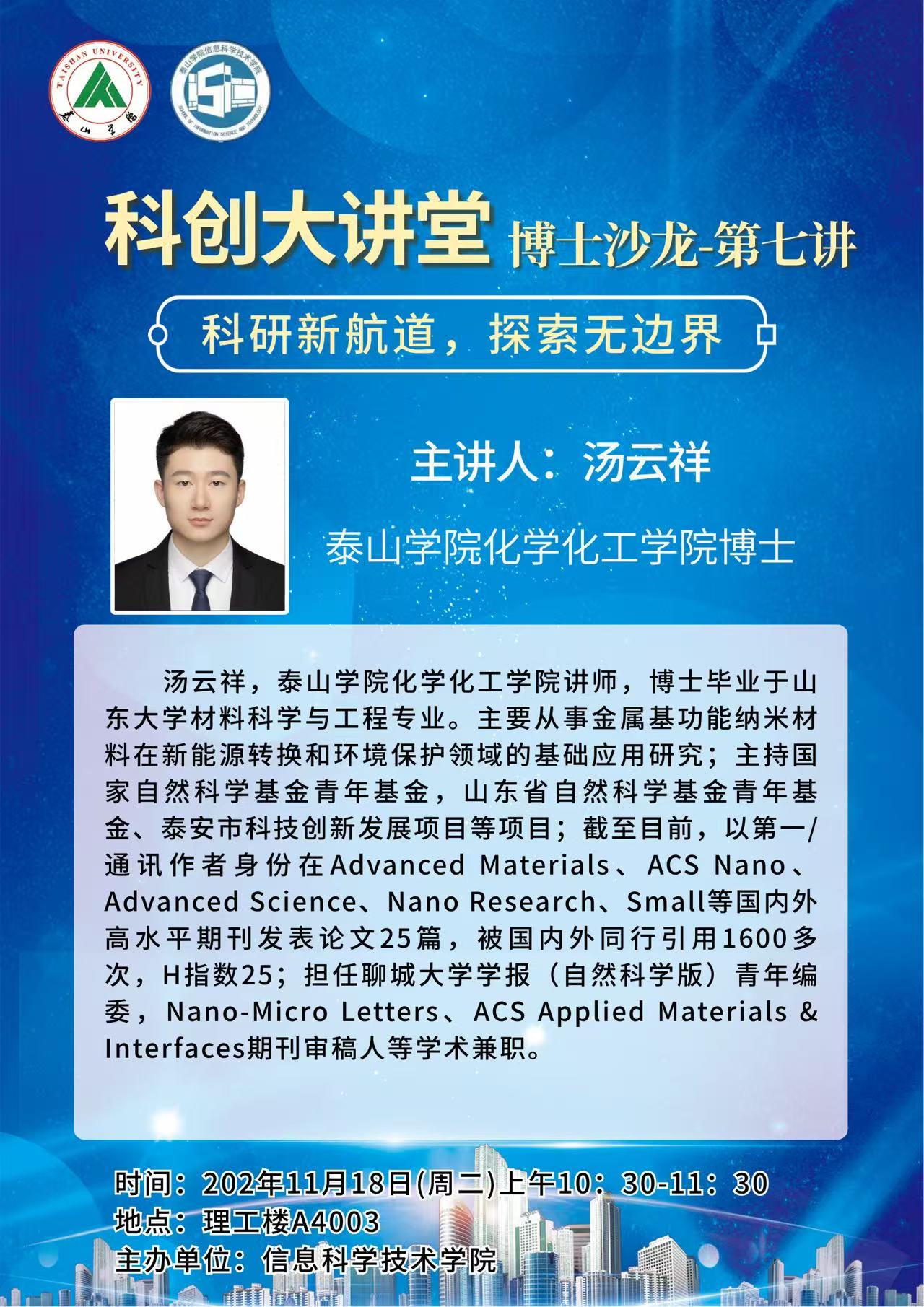11月18日上午,信息科学技术学院“科创大讲堂”博士沙龙第七讲以“科研新航道,探索无边界”为题成功举办,本次讲座邀请化学化工学院汤云祥博士担任主讲嘉宾,为学院青年博士作了题为《科研起步与成长:基金申请与科研工作的一些体会》的专题报告,本次活动是“科创大讲堂”博士沙龙创办以来首次邀请院外专家交流,标志着该项活动跨学院、跨学科交叉融合迈出了重要一步。学院党委书记安其心出席会议并讲话,副院长张国锋主持会议,学院青年博士教师参加会议。
