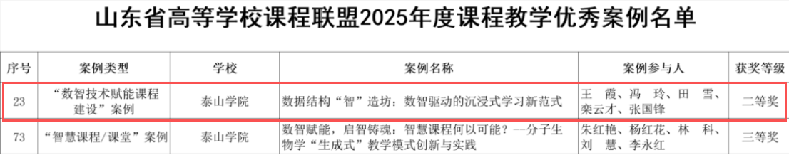 近日,山东省高等学校课程联盟公布了2025年度课程教学优秀案例评选结果,学校推荐的两项教学案例全部获评。其中,我院王霞教师团队申报的《数据结构“智”造坊:数智驱动的沉浸式学习新范式》教学案例荣获二等奖。